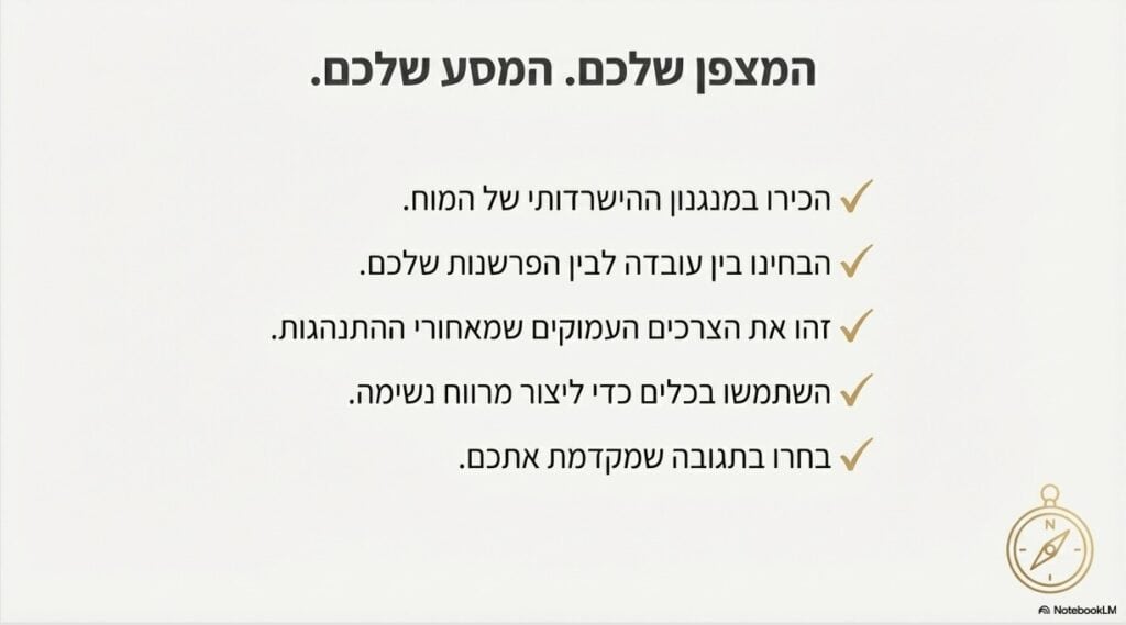 הרגש כרמזור: כל רגש לא נעים (כעס, תסכול, דריכות) הוא למעשה "רמזור אדום" המאותת לנו שצורך חיוני שלנו לא מקבל מענה כרגע. התסכול לא מעיד על סכנה קיומית (אריה), אלא על כך שהצורך שלך בודאות, בהכרה או בשקט צמא למילוי. ברגע שאנו מבינות שהרגש הוא שליח שבא לספר על צורך ולא על איום, החרדה יורדת.