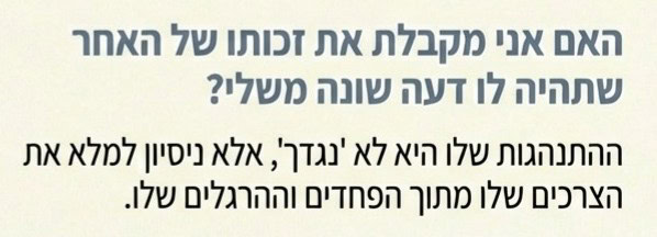 • הפרדה בין אי-הסכמה לדחייה: זה שהורה, בן/בת זוג או מנהלת לא מסכימים איתך, לא אומר שהם דוחים אותך. למדי להפריד בין הדעות שלהם לבין הערך עצמי שלך.