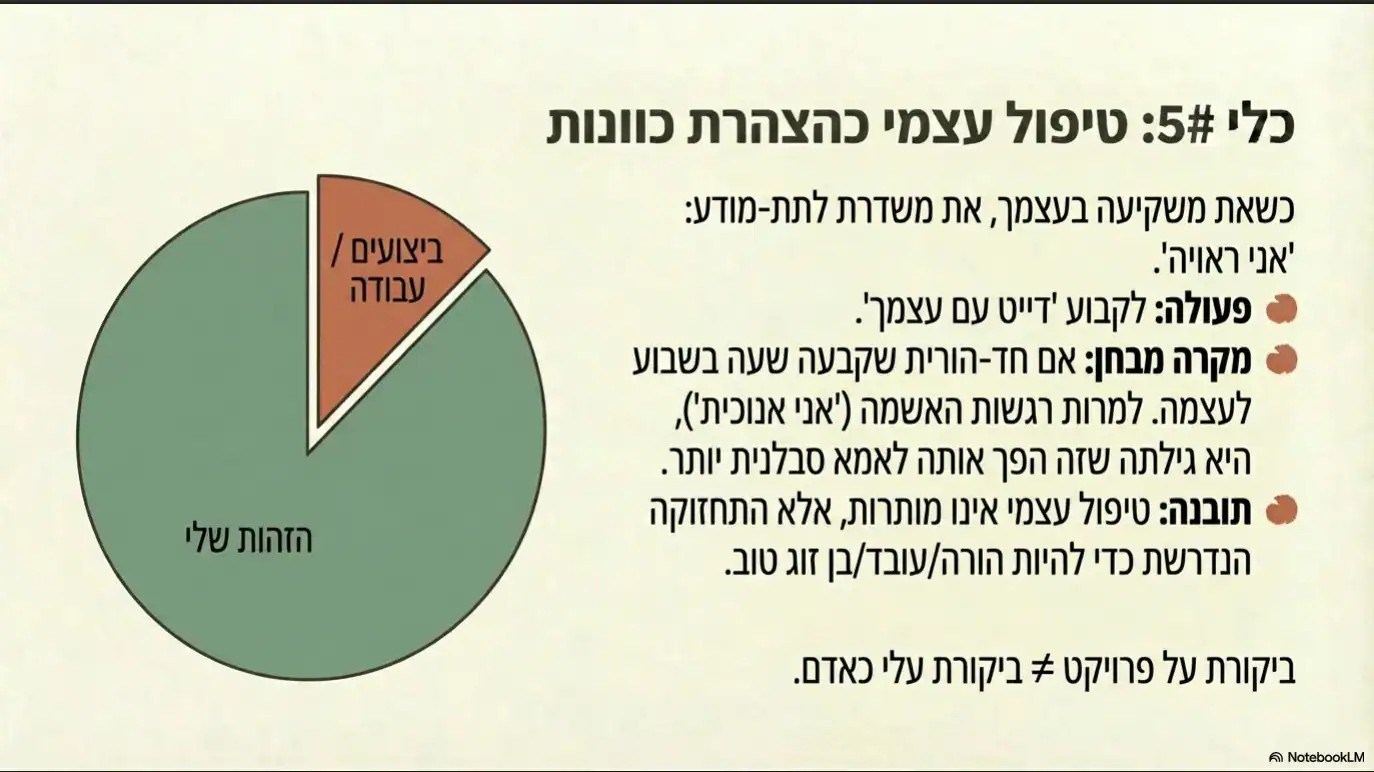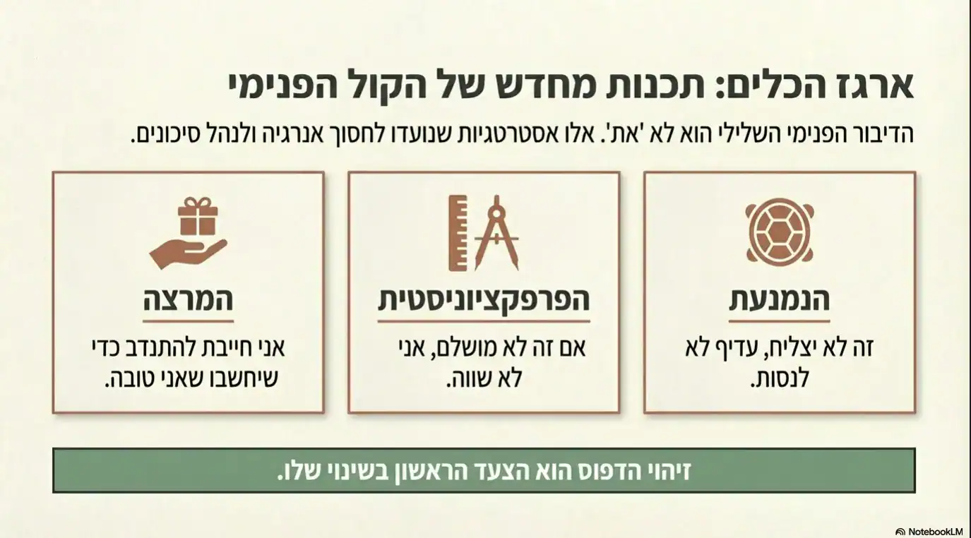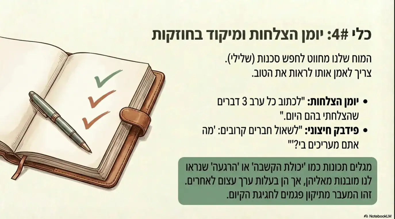 • הדיבור הפנימי הוא המפתח: ה"רדיו" הביקורתי בראש שלך הוא רק הרגל, הוא לא האמת. יש לך את הכוח המוחשי (באמצעות מנגנון המטקוגניציה) "להעביר תחנה" לקול תומך ומועיל הרבה יותר.