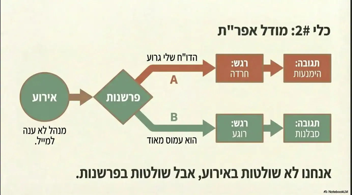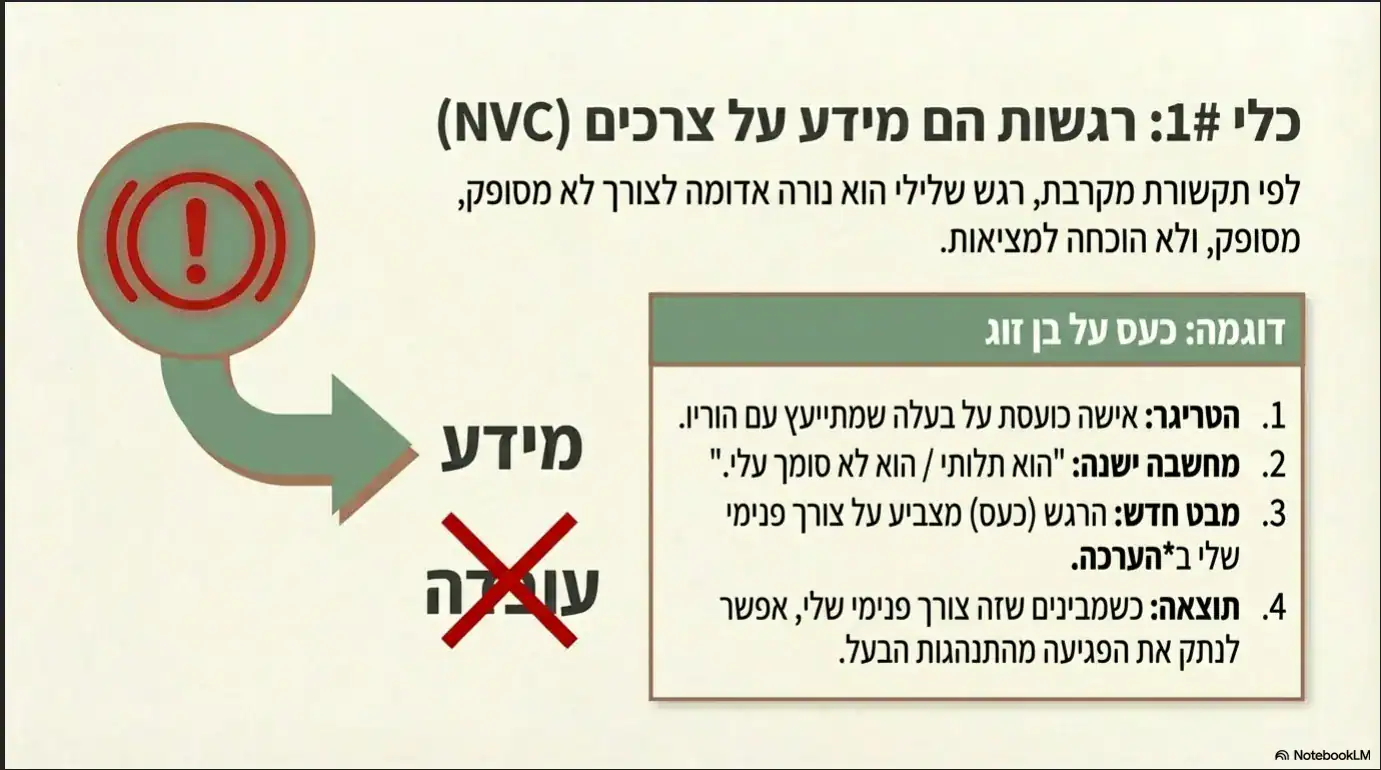 • כלים לשינוי מיידי: במאמר תמצאי שיטות פרקטיות כמו מודל אפר"ת (לשינוי פרשנויות), זיהוי צרכים רגשיים (תקשורת מקרבת) וחקירת מחשבות (ביירון קייטי) שיעזרו לך בזמן אמת.